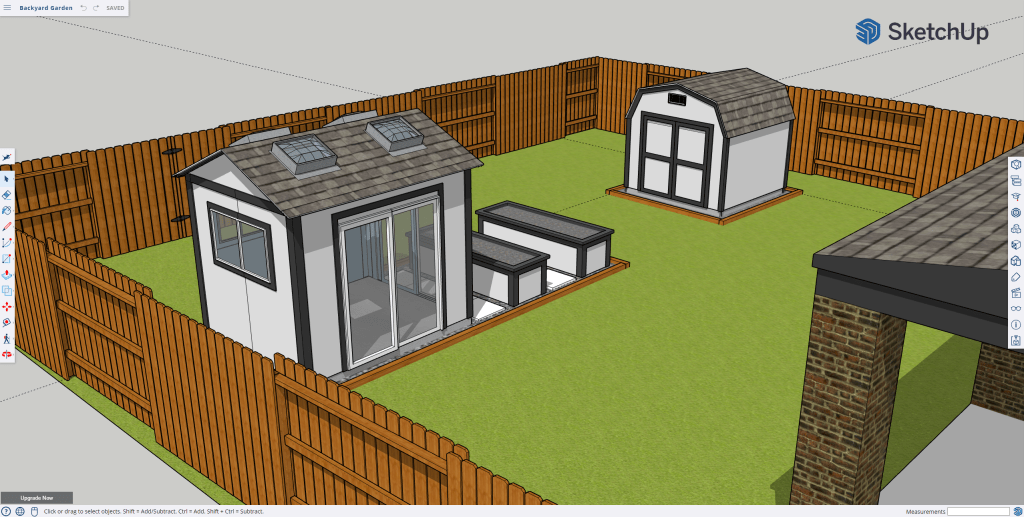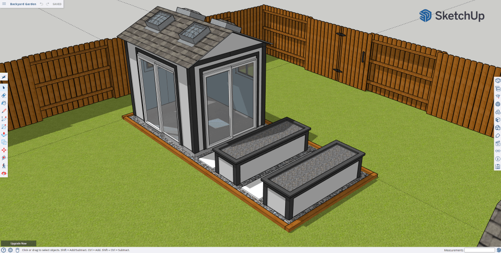 BB designed the entire backyard build using the free version of SketchUp. You can see the renderings below (which closely resemble the finished product of all three builds [shed, raised beds, and greenhouse]).